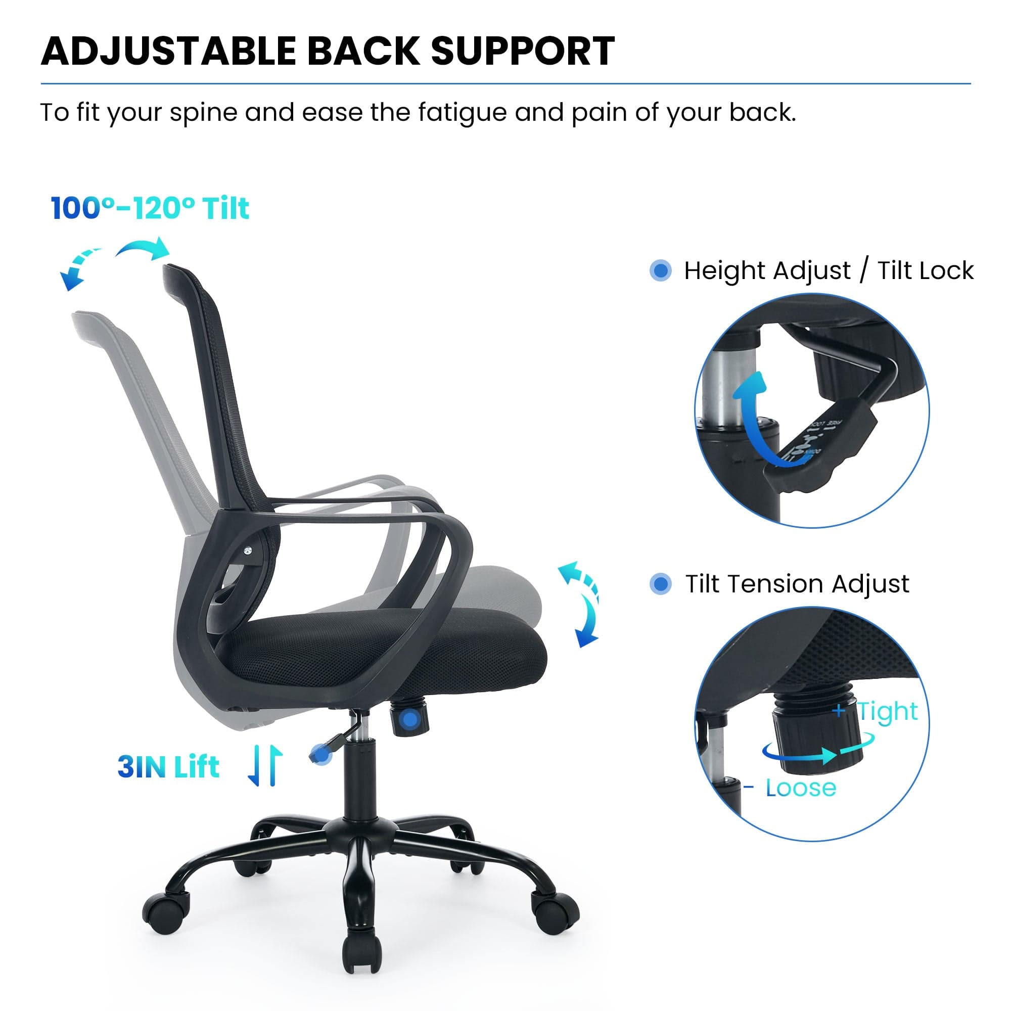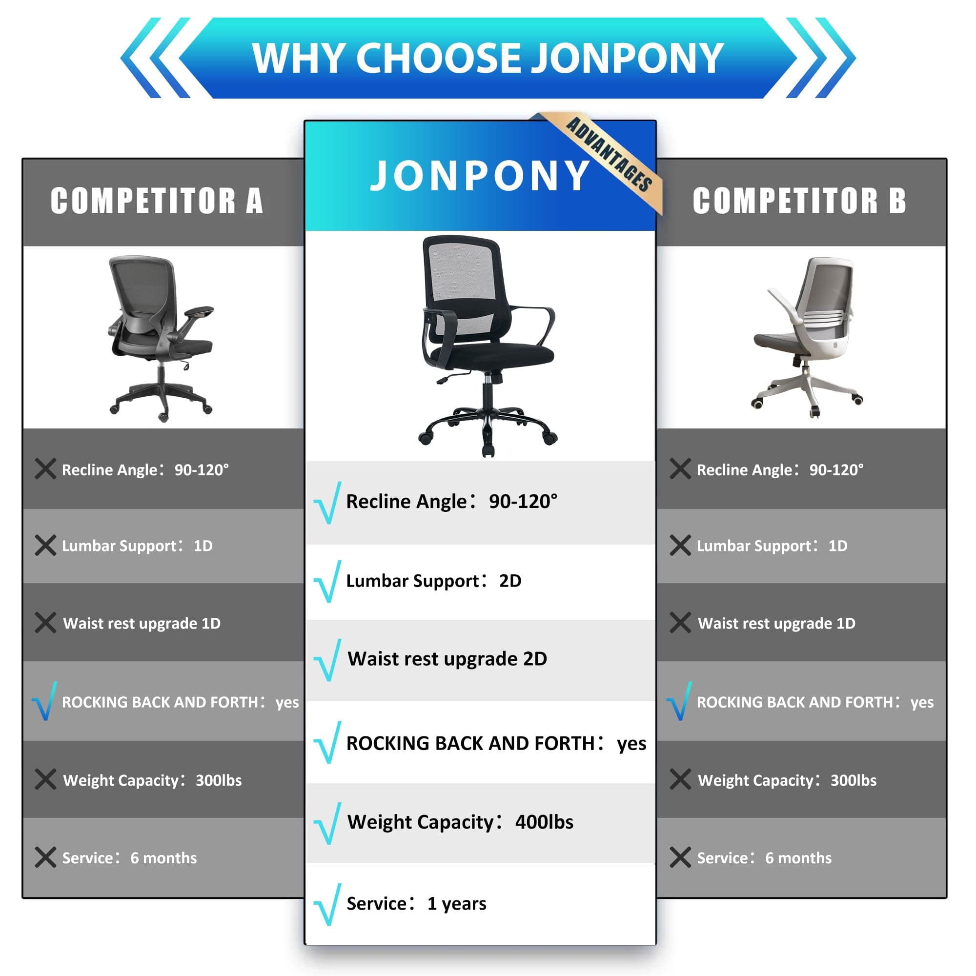 - JONPONY ergonomic office chair has innovatively added dynamic adaptive adjustable lumbar support which can effectively relieve lower back pain. The lumbar support of office chair can be adjusted in 1.18in heights to fit your lumbar spine better and avoid lumbar overhang.