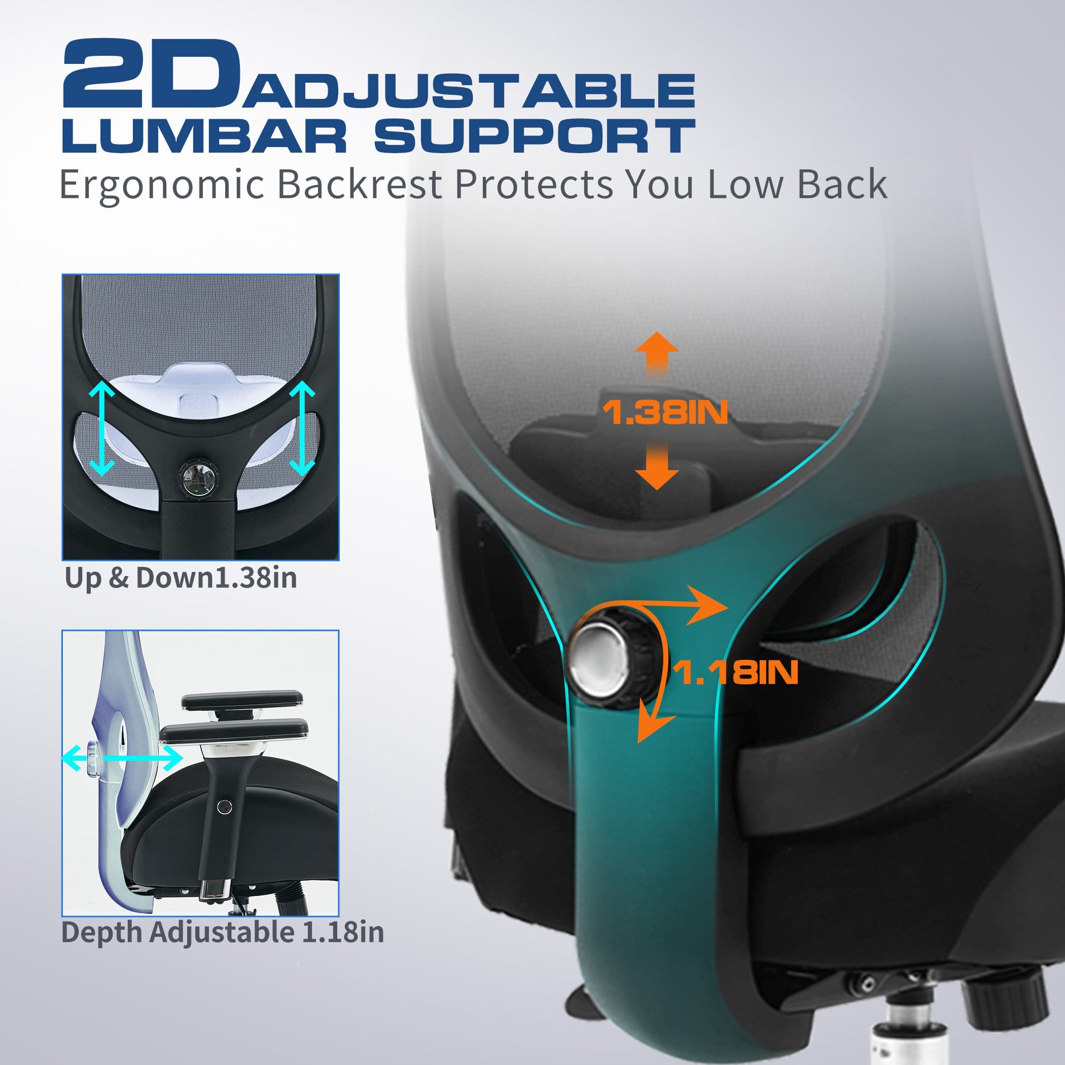 • Tired of office chairs that make you slouch and cause back pain?ย  ย The JONPONY office chair features built-in 2D adjustable lumbar support, so you can easily customize back support to fit your posture and needs.ย  ย Whether you're leaning back in thought or sitting forward to focus, the ergonomic design conforms to your body and relieves pressure from your lower back โ€” making long workdays more comfortable.