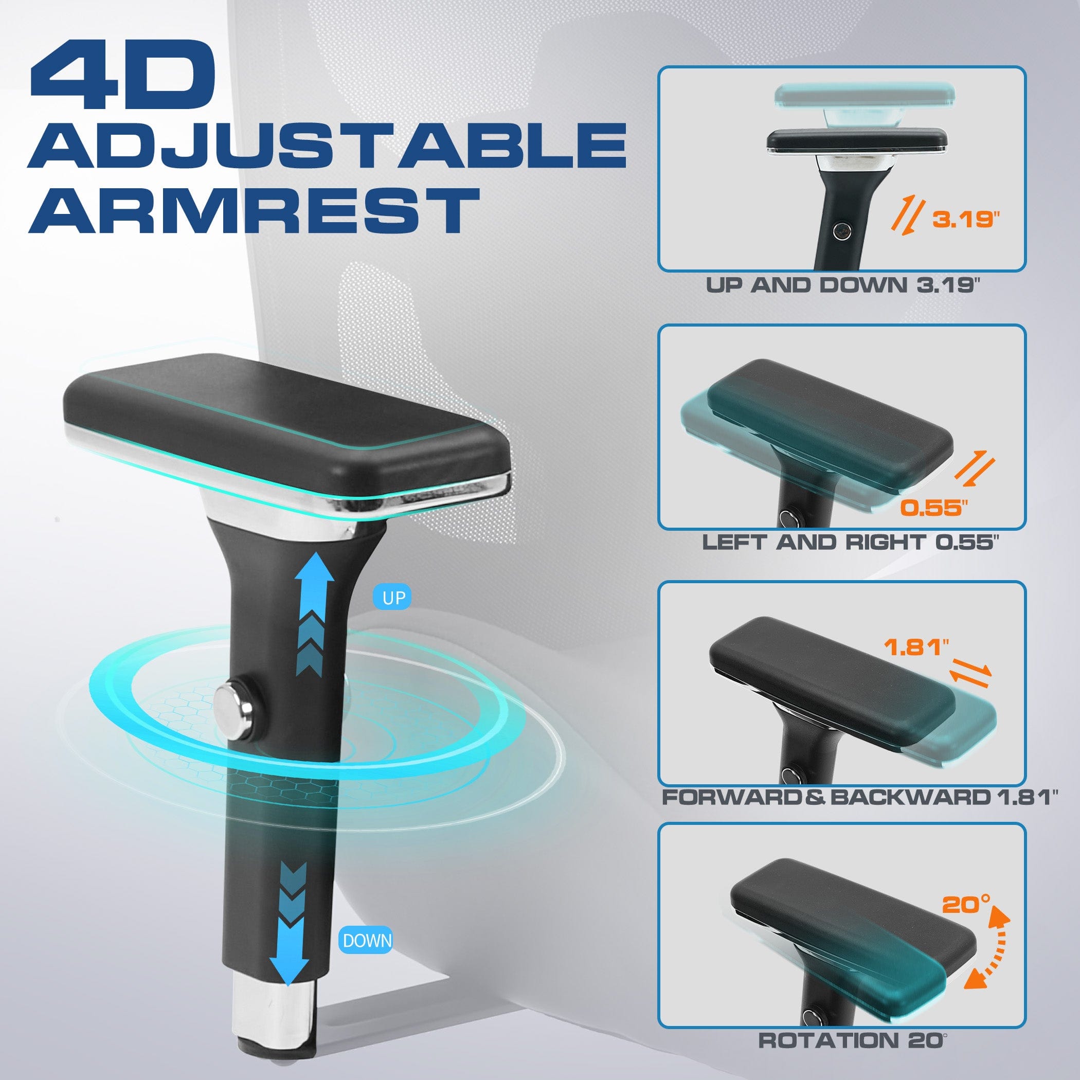 • Say goodbye to bulky, fixed armrests and hello to ultra-versatile 4D adjustability.ย  ย Our redesigned armrests move in multiple directions, allowing you to find the perfect position to enhance comfort and productivity.ย  ย Thick padding provides reliable support for your arms and elbows, while the sleek matte black finish seamlessly fits into any modern home or office setting.