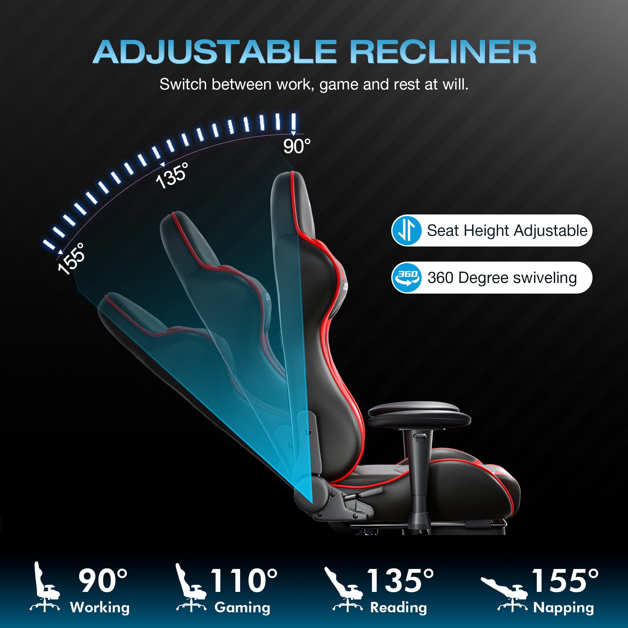 - 【Spacious and Luxurious Gaming Chair】- Designed especially for those who feel fatigued after prolonged sitting, this spacious gaming chair comes with a footrest. Just pull out the footrest, rest your feet, play some music, and instantly indulge in a cozy ambiance. Crafted from high-quality PU leather, it's breeze to clean—just give it a wipe with a soft cloth for a revitalized look.